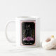 Magnífica taza con un ambiente celeste brumoso, con la tarjeta estilo Tarot de gato negro en colores negro y rosa.