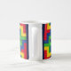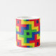 Una taza del café con leche con un diseño colorido, abstracto de un choza-edredón del remiendo de Judy Adamson.