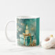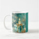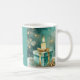 This cozy mug features a glowing candle atop a beautifully wrapped teal gift box, surrounded by twinkling lights and pine branches. A perfect balance of warmth and elegance, it captures the magic of Christmas evenings. Great as a seasonal decor piece or a heartwarming gift for coffee and tea lovers.