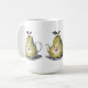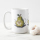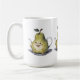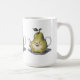 Sonriente taparo de café con tetera de pera. Una tetera de pera con unas manos y piernas lindas sonrió brillantemente sobre un plato, grandes semillas por su boca como botones de bonito.