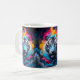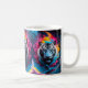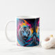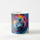 El tigre está representado en su mayoría en tonos azules, con motivos intrincados y elementos brillantes adornando su piel, sobre todo alrededor de su cara y cuerpo. El fondo cuenta con un diseño ornamentado y simétrico con motivos celestes, como lunas de media luna, estrellas y patrones giratorios. El efecto general es de otra belleza mundana, mezclando elementos de naturaleza y fantasía a la perfección. La intensa mirada del tigre y su postura regal contribuyen a la sensación de poder y misterio que emana de las obras de arte.