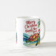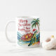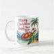 Un caprichoso Navidad recibe una tarjeta con una alegre acuarela de ilustracion de una tortuga marina con un festivo sombrero de Santa Claus y adornada con luces de Navidades relucientes colocadas alrededor de su concha, con un telón de fondo de una palmera que se balancea también iluminada con luces cálidas y un tranquilo océano turquesa. El caparazón de la tortuga está pintado con intrincados patrones de flores tropicales en suaves tonos pastel de coral, lavanda y verde marino, mientras que el océano tiembla con sutiles gradientes de azul y plata, creando una atmósfera tranquila y a la vez festiva. "MERRY CHRISTMAS & HAPPY NEW YEAR" aparece en una letra juguetona con letras a mano en la parte superior de la tarjeta, con el interior ofreciendo un espacio blanco limpio para un mensaje personalizado y un sutil y repetitivo patrón de pequeñas conchas marinas a lo largo del borde inferior para reforzar el tema tropical. El tono general es alegre y alegre, perfecto para enviar cálidos deseos a amigos y familiares durante las vacaciones.