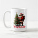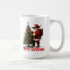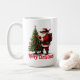 This image features a Santa Claus who looks like he's just come off the trail, complete with a large backpack and rugged boots. He's standing next to a fully decorated Christmas tree, carefully hanging an ornament. His traditional red suit is paired with a soft Santa hat. The festive scene captures a moment of holiday work, and the message "Merry Christmas" is written beneath the image.