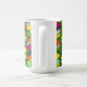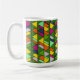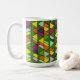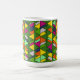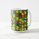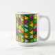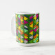Esta taza tiene un diseño moderno de mediados de siglo de triángulos superpuestos en colores floridos que corren verticalmente sobre un campo de verde.