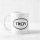 ¡Compruebe hacia fuera esta taza de Troy! ¿Es su nombre Troy? ¿O usted tiene un marido, un novio, un miembro de la familia masculino o un varón Troy nombrado amigo? ¡Si es así esta taza del "sello conocido" es exactamente el regalo que usted está buscando! Las características del diseño "Troy" en las letras negras grandes rodeadas por dos óvalos, uno fino y uno grueso.
