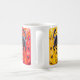 Playful black cat art pops on both sides of this two-tone mug, with one panel in bright sunny yellow and the other in bold fiery red. The cat arches over a yarn ball, surrounded by fun doodles, arrows and stars, creating a dynamic pop-art look that stands out in any kitchen and instantly catches the eye of cat lovers.