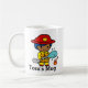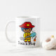 Un chico lindo con el pelo azul vestido con el uniforme de bombero con una manguera de bomberos apagando el fuego. Para el bombero o el futuro bombero. Personalizar el texto.