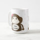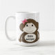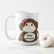 Delicioso en tu bebida con esta taza adornada con un mono humorístico que luce una gran sonrisa, piel oscura y un arco de cabello rosa. Está colocado sobre un fondo blanco, moteado con puntos rosas y enmarcado por un borde rosa. La frase 'mono pequeño' es personalizable a tu preferencia.