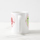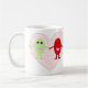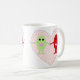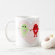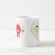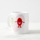 Una taza con un lindo personalizado de una sonriente uva roja sosteniéndose las manos con una sonriente uva verde con un corazón rosa bonito en el fondo, ambas uvas tienen brillantes ojos negros y bocas rosas.