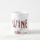 Texto decorativo del vino o palabra de color rojo oscuro o burdeos y manchas y manchas rojas oscuras que imitan las manchas del vino. Impresiones y regalos para diversión y buen humor. Productos y souvenirs horizontales o orientados al paisaje.