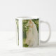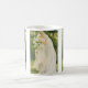 This image portrays an elegant bride standing gracefully in a lush, sunlit garden. She wears an ivory wedding gown adorned with delicate lace, subtle beading, and a softly gathered waist accentuated by a jeweled brooch. A long, translucent veil cascades behind her, catching the light and adding a sense of movement and ethereal beauty. The bride gazes gently downward at a cascading bouquet of white lilies and greenery, her expression calm and contemplative. Surrounded by dense foliage and tall trees rendered in soft, painterly tones, the scene evokes a romantic, timeless atmosphere inspired by classical illustration and Art Nouveau aesthetics.