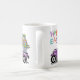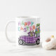 Este lindo tazón de café es una gran elección para un regalo de Pascua. Este diseño incluye un conejo de conejo color marrón montado en una camioneta de gingham púrpura. En la parte trasera hay una cesta llena de huevos de color turquesa, rosa, morado y naranja. Arriba está escrito, "Feliz Pascua" en una tipografía colorida. Diseñado por la artista de renombre mundial ©Tim Coffey.