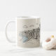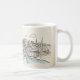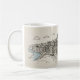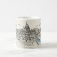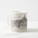 Dibujo estilizado de un paisaje urbano con varios edificios, una cúpula central y un puente sobre el agua.