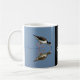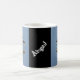 Esta hermosa taza de té o café matutina con naturaleza muestra una foto que captura a un hermoso pájaro remo blanco y negro sumergiendo su largo pico en el tranquilo agua azul. El reflejo del pequeño pájaro se ve claramente en el agua como un espejo. El pájaro aparece a ambos lados de la taza con un rectángulo negro en el centro para tu nombre que aparece en letra blanca.