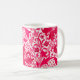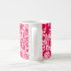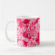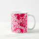 tazón de café con una estampada floral de William Morris vintage de lirios estilizados e irlandeses, realzada digitalmente y coloreada, en tonos de luz a fucsia profunda rosa y vino tinto profundo sobre un fondo blanco