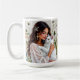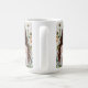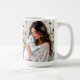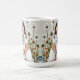 A pretty coffee mug with an illustration of a woman holding a white fluffy cat surrounded by dandelions, The picture has a crochet style fabric look.