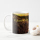 Café Mug mostrado con una foto impresa de las hermosas cascadas en el Parque Nacional Yellowstone. Personalizar este artículo o compra tal cual. Imagen de stock