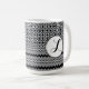 La parte superior de la taza está cubierta con un patrón de medallón retro repetido con formas de diamante cóncavo dentro, y la parte inferior tiene filas de zigzags de diferentes espesores. En el centro, donde se encuentran los motivos, hay un medallón de círculo blanco con un borde punteado en blanco y negro. Sobre eso hay un espacio para tu monograma. Cambia la carta a lo que quieras. También puede cambiar el tipo de letra del monograma si lo desea.