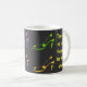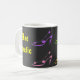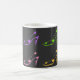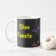 Taza de café para las hembras que aman los zapatos del tacón alto. El lunar colorido del diseñador se inclina con el logotipo shopaholic de la diversión en un fondo negro intrépido.