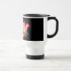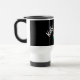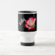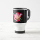 Floración rosada brillante de la flor del ● en fondo negro de la taza de consumición blanca del acero inoxidable con la tapa y la manija.