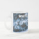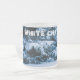 Nieve cubierta de abetos en el bosque. Nieve blanca y fresca, colores azul y verde, ánimo invernal. ¡Feliz Navidad y Feliz Año Nuevo para ti y para ti! Coffee mug. Puede cambiar o eliminar el texto de la plantilla Navidades blancos.
