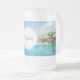 Una taza de escarcha con una hermosa foto que muestra un complejo de playa tropical. agua azul bonito y playa de arena blanca con cabañas de paja que le confieren un ambiente tranquilo a la isla. Un círculo blanco se cubrió encima con su nombre y monograma inicial dentro.