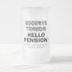 Adiós tensión hola pensión feliz retiro diversión Frosted Glass Beer Mug. Regalo de bebida personalizado para amigos y familiares jubilados. Idea de regalo de trabajo/trabajo para compañeros de trabajo, jefe, padre, marido, colega, entrenador, profesor, pensionista, etc. Cita humorística con tipografía graciosa y nombre de jubilado.