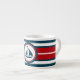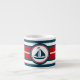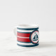 Diseño náutico con decoración de velero en forma redonda sobre fondo rayado rojo, azul y blanco