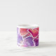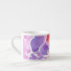 Una taza de café espresso de bonito, con un bonito diseño acuático de flores de pared en tonos rosa, malva, violeta y azul, de un diseño pintado a mano por Judy Adamson.