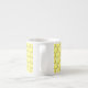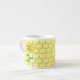 Esta impresionante taza de espresso presenta una imagen gráfica de un lindo abejorro amarillo con rayas negras, ojos, antenas y piernas. Tiene alas azul y blanco bonito. La abeja está sentada en medio de un girasol amarillo dorado. La flor tiene un tallo verde y tres hojas. El mensaje "feliz día de la abeja" aparece esparcido en las tres hojas. El fondo está compuesto por un patrón de abeja amarilla.