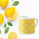 Una taza espresso blanca y amarilla de limón soleado con un patrón geométrico.