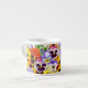 Unas hermosas pansies en tan encantadoras tonalidades, caen sobre esta colorida taza, para llevar la alegría de estas flores amigables y amadas a tu casa. ¡Disfrútalo!