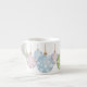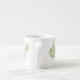 Esta taza de espresso presenta tres adornos navideños de color no tradicional en verde pastel, rosa y azul con estrellas blancas. Los adornos de diferentes tamaños rodean la taza sobre un fondo blanco.
