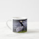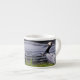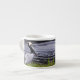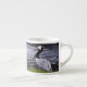 En tonos suaves de azul, gris y marrón, el pelícano marrón en la fotografía original de MaeFlowers en esta Copa Espresso está posando al borde del agua, esperando a que los peces se bañen. La luz se refleja en las plumas brillantes y resalta las ondas en el agua. Un poco de hierba verde a lo largo del fondo termina la foto.