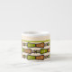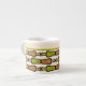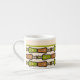 Un pequeño espresso de moda para personalizar con un decorativo patrón 'tribal' en verde y Verde azulado, delineado en negro, en un fondo crema, unido con puntos de Polka a juego. Parte de la colección "Tambores de la jungla" de Pintorly y Pintorly.