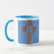 Aguantando símbolo cristiano en Irlanda y Escocia, la cruz céltica es una expresión hermosa de la fe. Aquí, una vieja cruz de plata se ha fotografiado y se ha impreso contra un fondo azul en una taza de café de cerámica. La taza del "campanero" está disponible en seis colores viene en dos tamaños - el lavaplatos 11oz o 15oz y las manijas grandes seguras de la microonda hacen fácil llevar a cabo otros estilos disponibles