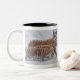 Esta taza de café hermosa ofrece una pintura al óleo original por Juan Hopkins que ofrezca una mamá siempre vigilante del tigre y sus dos cachorros que se mueven con una escena nevosa del desierto.