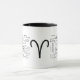 Esta taza de la astrología del zodiaco de la muestra del sol del aries tiene nubes de la palabra en fuentes mezcladas de los rasgos del aries en dos lados con el símbolo de la astrología para el aries en el centro. Esto es un regalo perfecto para cualquier aries.