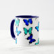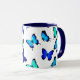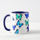 El modelo original de la bella arte de las mariposas azules y verdes coloridas de la selva del diseñador Carolyn McFann del estudio de ronroneo de dos gatos imprimió en una taza de la calidad y del personalizable para las fans de la mariposa.