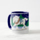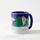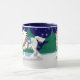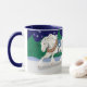 caballos de proyecto grises ilustrados. En un lado un clydesdale con un gorra y una barba de santa lleva bolsos de regalos. En el otro los galopes majestuosos de un proyecto con las campanas de navidad en su cuello y una paloma del blanco diseñan en su silla de montar. Escena del invierno con los árboles de navidad y el cielo nocturno estrellado detrás. Una taza preciosa del día de fiesta para los amantes del caballo.