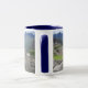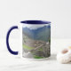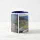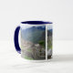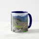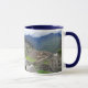 taza blanca con picchu del machu en él con el borde y la manija azules