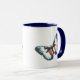 la taza presenta una bonita mariposa azul y roja en cada lado.