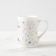 Lively abstract confetti pattern mug. Irregular dots, triangles, circles, and dashes in coral, powder blue, and mustard yellow pop on light grey. Flat vector style with subtle gradients adds modern depth. Perfect for colorful, high-energy beverage lovers or as a vibrant gift.