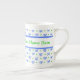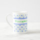 Un tazón de café de porcelana de bonito, hueso de personalizable, con un patrón de arcos y manchas en azul y verde sobre un fondo blanco, de un diseño pintado a mano por Judy Adamson. También hay una máquina de té y una jarra de cocina.