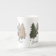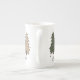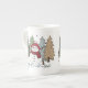 Disfruta de tu taza de té en esta hermosa taza de porcelana de hueso de un muñeco de nieve en los árboles de Navidad, el texto es "Bebé, hace frío afuera"