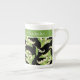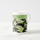 Un tazón de café de la China ósea para personalizar, con un patrón de estilo Art Nouveau de Lilies-of-the-Valley sobre un fondo negro; de la colección Posh & Painterly 'For the Love of Lilies'.