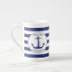 Esta taza temática náutica ofrece un ancla con una frontera circular de la cuerda. La palabra "capitán" está por encima y por debajo de es un nombre para que usted personalice. El fondo es rayas de los azules marinos y del blanco.