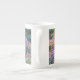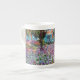 Una taza clásica colorida de la porcelana de hueso que ofrece los iris en un jardín, pintado por el pintor impresionista francés Claude Monet.