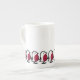 Cute robins marching across a bone china mug. My original illustration of nine happy birds walking in a line, drawn in an elegant but rustic style designed to look like an ink stamp, with thick black lines and a flash of red.