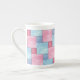 Un tazón de bonito de porcelana de té o café, con un mosaico de diseño de denim rosa y azul, de una acuarela pintada a mano por Judy Adamson.